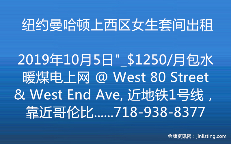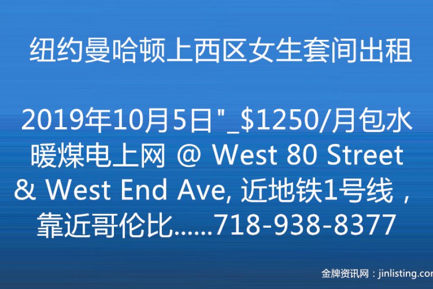 “纽约曼哈顿上西区女生套间出租_$1250/月包水暖煤电上网 @ West 80 Street & West End Ave, 近地铁1号线,靠近哥伦比亚大学和福德汉姆大学。 门卫电梯公寓4楼。 一个带家具小卧室,独用洗手间,和一个日本人阿姨和一个华人女生共用厨房以及室内洗衣机。 寻安静干净单身女生室友,预约即可看房,可以马上入住。 半年以上起租,需佣金。 咨询看房Wendy 电话:718-938-8377 微信:Q612597 邮件:wendy@taichirealty.com 公司网址:http://www.taichirealty.com”