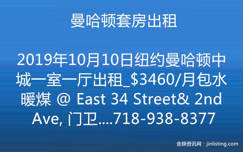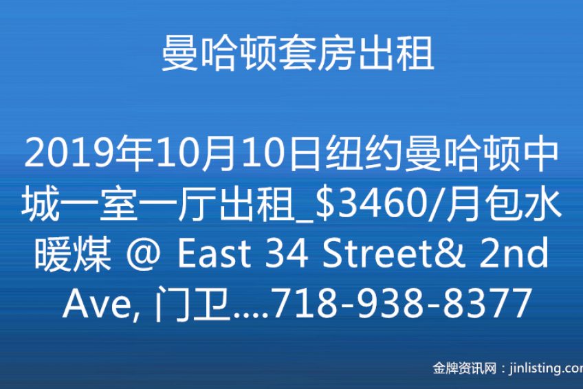 纽约曼哈顿中城一室一厅出租_$3460/月包水暖煤 “纽约曼哈顿中城一室一厅出租_$3460/月包水暖煤 @ East 34 Street& 2nd Ave, 门卫电梯公寓16楼,楼内洗衣房。 住客可免费使用楼内健身中心和屋顶露台。 现在租入,不仅免佣金还赠送一个月免费入住。 赠送后租金净价仅$3172/月包水暖煤, 今天实拍照片,欢迎私信索取Video。 预约即可看房,可以马上入住。 咨询看房Wendy 电话:718-938-8377 微信:Q612597 邮件:wendy@taichirealty.com 公司网址:http://www.taichirealty.com”