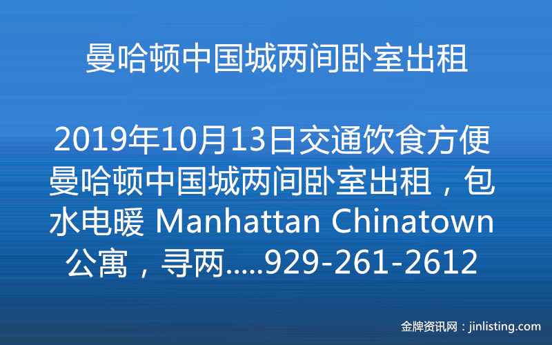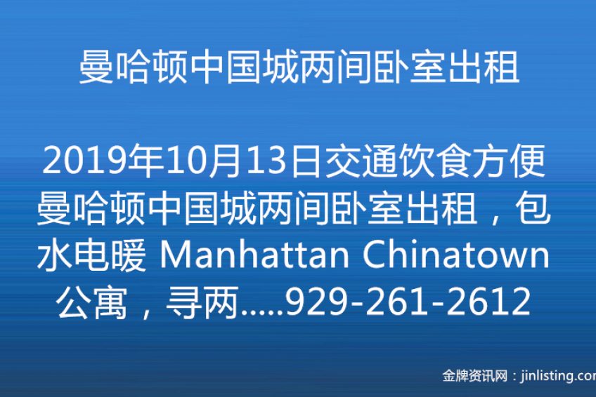 曼哈顿中国城两间卧室出租,交通饮食方便 “曼哈顿中国城两间卧室出租,包水电暖 Manhattan Chinatown 公寓,寻两位单身安静室友 最好是学生或白领, 11/1起租,半年以上。 主卧$1150/月(12平米左右),有两扇大窗,可以看到下东区风景/夜景 次卧$950/月(10.5平米左右),两扇大窗,逃生通道,公寓最里间十分安静。 三室一厅一厨一卫,客厅公用。公寓第7层带电梯,楼上通向天台。旧公寓,基础设施比较老,室内环境整洁,光照充足,通风良好,算附近性价比很高的房间。 交通: 交通便利程度一流。楼下半分钟到B/D地铁,2分钟到J, 其他有4/6/F等稍远 走路去NYU 10分钟,坐地铁/骑车去 Baruch 15分钟 走路到SOHO 10分钟 地铁到midtown或是WTC 15分钟左右 饮食: 附近都上百家粤菜,意大利菜,台湾菜,上海菜,西北菜,越南菜,烧烤,火锅,麻辣烫,卡拉OK,甜品奶茶应有尽有。 各大中美超市2-5分钟到,香港超市,德昌,whole foods,trader Joes, target, CVS,rite aid 等等。 农贸市场常年有,有机食品量大便宜随便挑。周末有美食广场等活动。 健身&娱乐: 附近有Regal 电影院,IFC center,各种画廊,健身房,酒吧等。走路十分钟到SOHO逛街。 楼下隔一条街是附近最大的公共公园,有塑胶跑道,篮球场,足球场,壁球场,花园,健身器,沙坑等。 散步去东河,哈德逊河,布鲁克林大桥等半小时左右。 欢迎转发,欢迎联系,看房私信: 短信:929-261-2612 微信: qmt19940114”