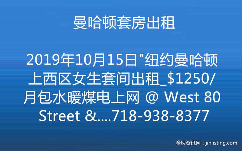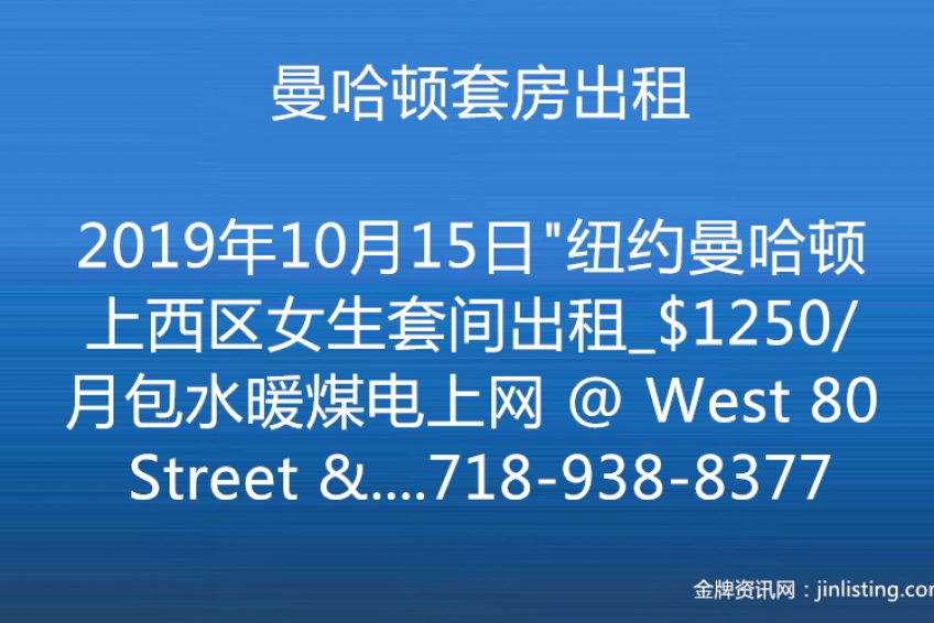 “纽约曼哈顿上西区女生套间出租_$1250/月包水暖煤电上网 @ West 80 Street & West End Ave, 近地铁1号线,靠近哥伦比亚大学和福德汉姆大学。 门卫电梯公寓4楼,室内洗衣机。 带家具独用洗手间卧室,。 和一个日本人阿姨和一个华人女生共用厨房以及室内洗衣机。 寻安静干净单身女生室友,预约即可看房,可以马上入住。 3个月以上租期即可。(短租价格另议) 咨询看房Wendy 电话:718-938-8377 微信:Q612597”