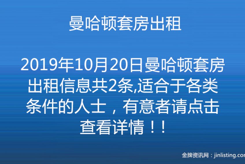 1. “纽约曼哈顿中城East 52st的带家具拎包入住公寓出租。 近地铁,独用明亮大卧室,有沙发客厅,可做饭厨房。 仅仅和一个华人年轻男生室友。 $1950/月包水暖电,可以马上入住,长短租皆可。 咨询看房电话:718-938-8377 微信:Q612597”