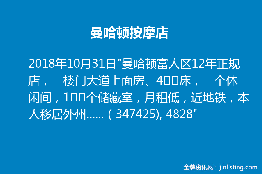 曼哈顿按摩店 “曼哈顿富人区12年正规店,一楼门大道上面房、4⃣️床,一个休闲间,1⃣️个储藏室,月租低,近地铁,本人移居外州。房东查信誉。非诚勿扰。 ☎️:(347425), 4828”