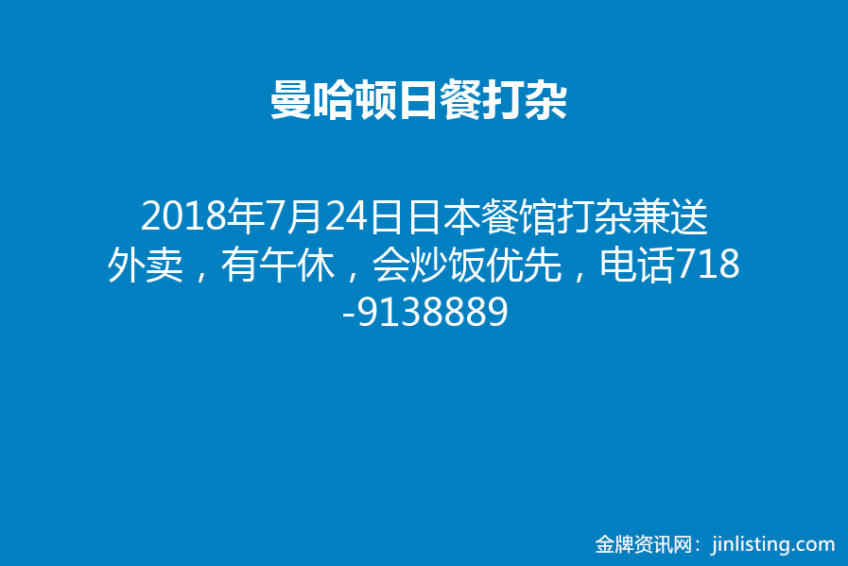 曼哈顿日餐打杂 日本餐馆打杂兼送外卖,有午休,会炒饭优先,电话718-9138889