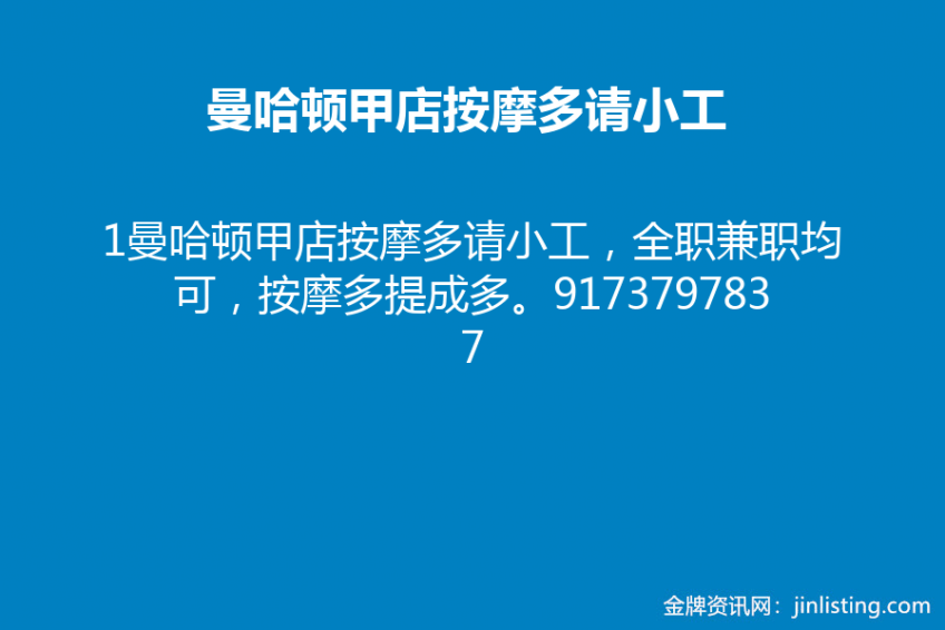 1曼哈顿甲店按摩多请小工,全职兼职均可,按摩多提成多。9173797837