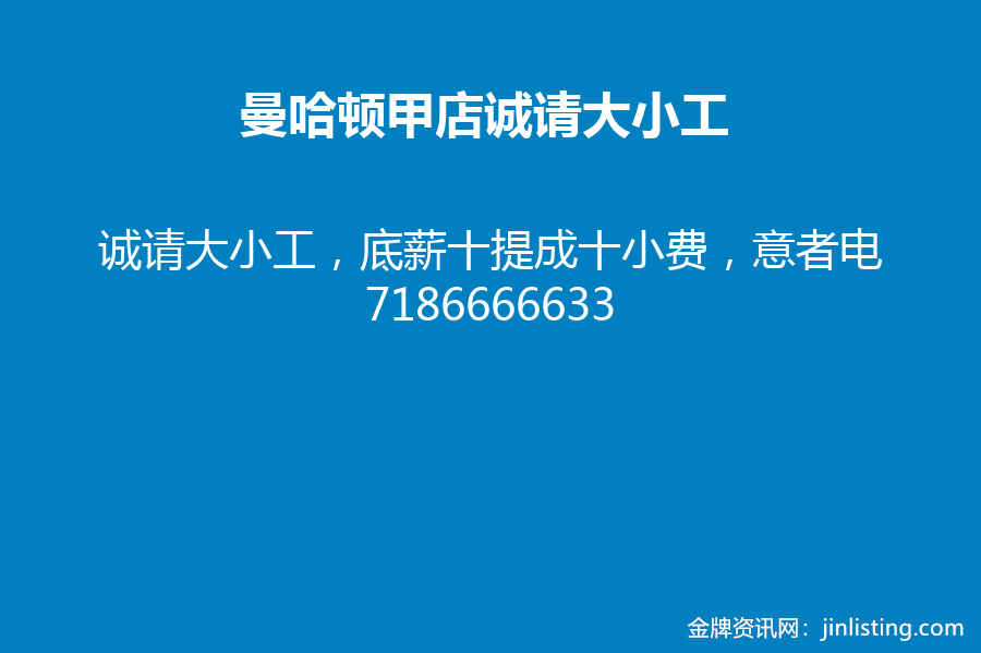 曼哈顿甲店请人 诚请大小工,底薪十提成十小费,意者电7186666633