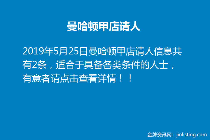 曼哈顿甲店诚请大工、小工各一名,好区好小费,地铁方便,靠纽约大学联系电话。6465959163