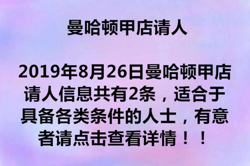 “曼哈顿中城甲店,招聘熟练小工,本店交通便手,工作时间可灵活安排,待遇佳! 要求:按摩好,工作高效认真。 有意者请电:917-741-6046,或留言!”