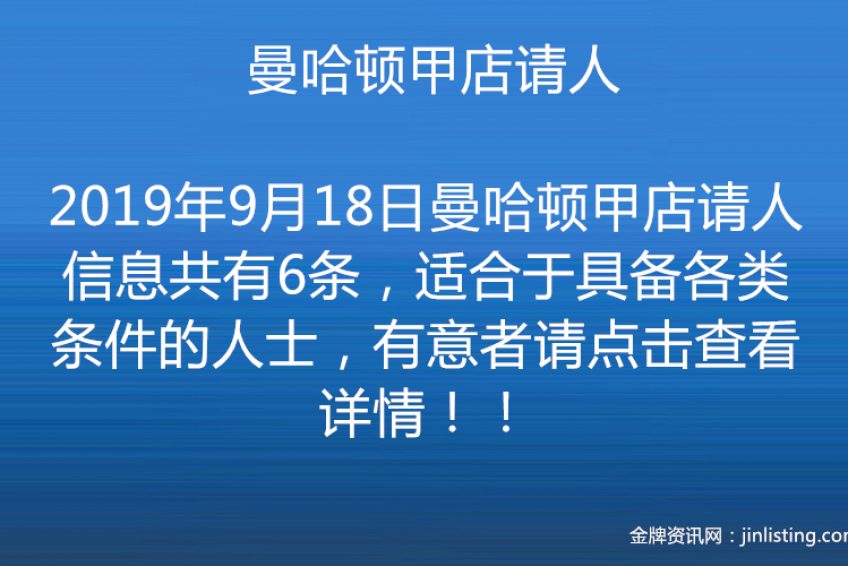 1. 曼哈顿美甲店招聘熟手工下午5点至10点电347 -703 -3198