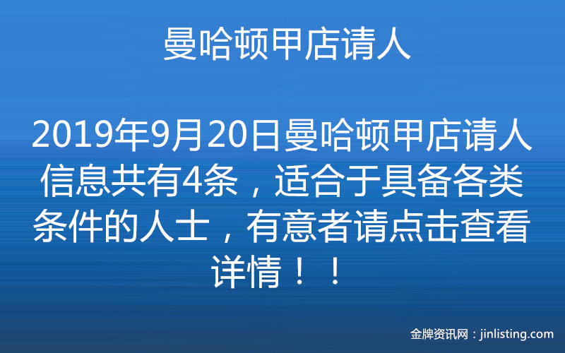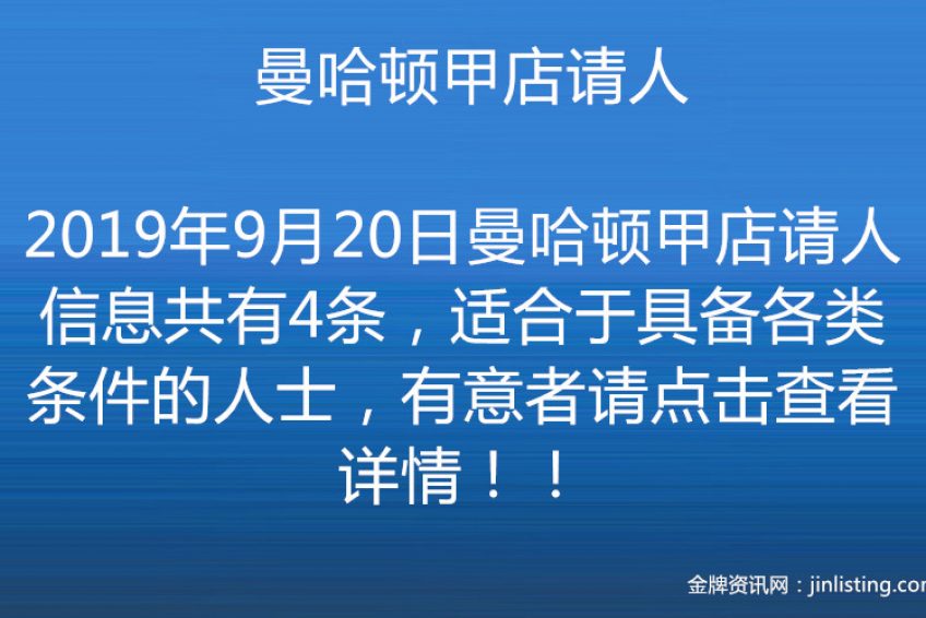 曼哈顿甲店请熟手大小工,底薪十抽成十小费 交通便利,电7186666633