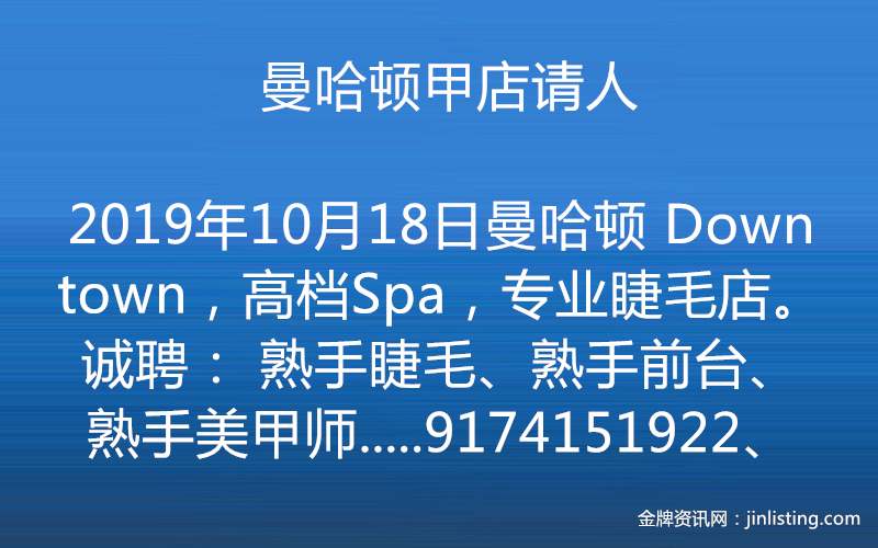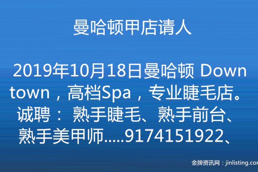 “曼哈顿 Down town, 高档Spa,专业睫毛店。 诚聘: 熟手睫毛、熟手前台、熟手美甲师 普通手脚$50,无粉!精按摩、Color Gel 优先(生手免!)。 联系电话:9174151922、6462266352”