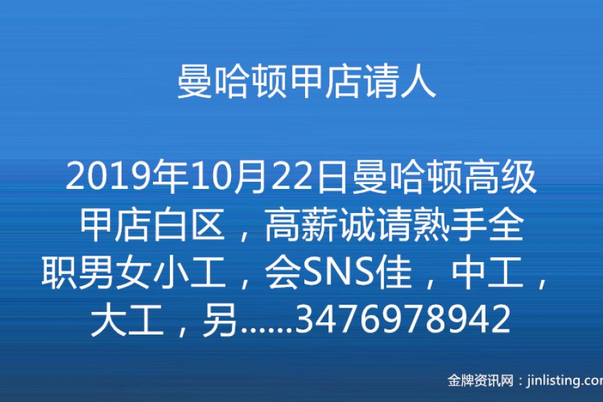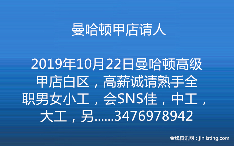 曼哈顿高级甲店白区,高薪诚请熟手全职男女小工,会SNS佳,中工,大工,另请专业按摩师,生手,part-time勿扰,有意请电 3476978942