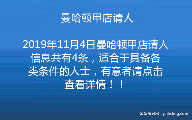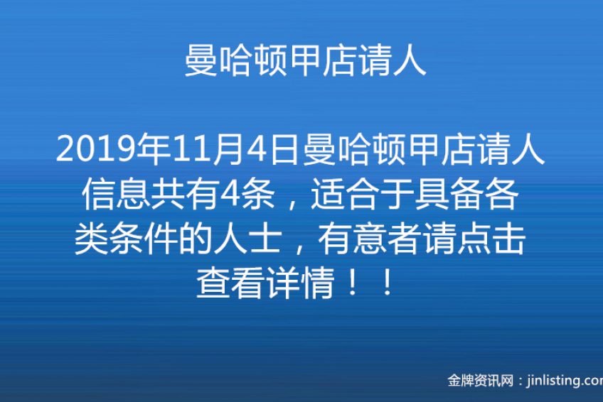 2.甲店请人 曼哈顿甲店:诚招熟手或半熟手做粉大工、中工。高底加分账客员足,店里分围好无压力,时间有弹性。招小工! 意者电:3477984148