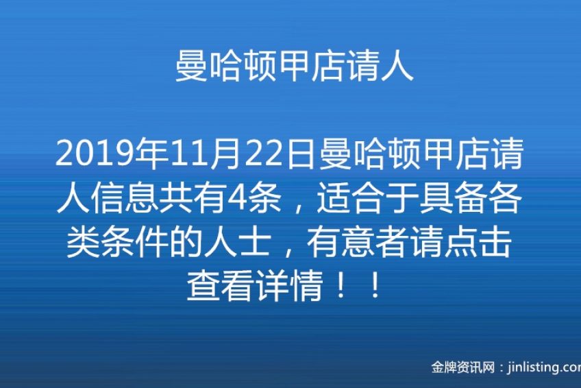 1. “曼哈顿中层白人区请熟手有责任心的女小工,能上晚班,会color gel+ spa脚,按摩,会点英文优先。 本店提成高,小费好,老板好相处,有意请电:347-400-1342或留言 Ps:如果不来了一定要通知到位,不要打了电话人不来。非诚勿扰”