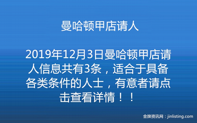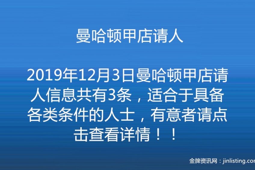 1.曼哈顿中城,好区,小费高。新开张spa店,招指甲小工,拔毛,美容。(917) 497-2666 招工