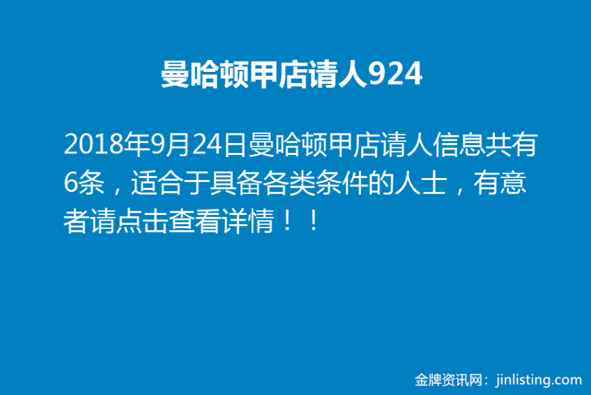 曼哈顿好区大型甲店环境好无臭粉,提成多,待遇优,交通方便,F M N R Q W 4 5 6 L 均可到达 。诚请有照熟手大小工,可教大工,美容。电话6462395388
