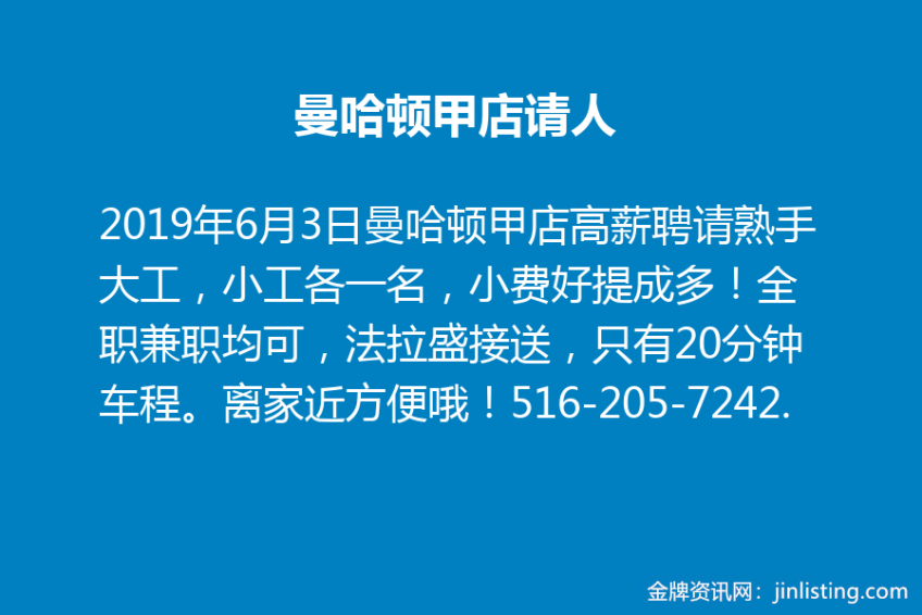 曼哈顿甲店高薪聘请熟手大工,小工各一名,小费好提成多!全职兼职均可,法拉盛接送,只有20分钟车程。离家近方便哦!请电516-205-7242.