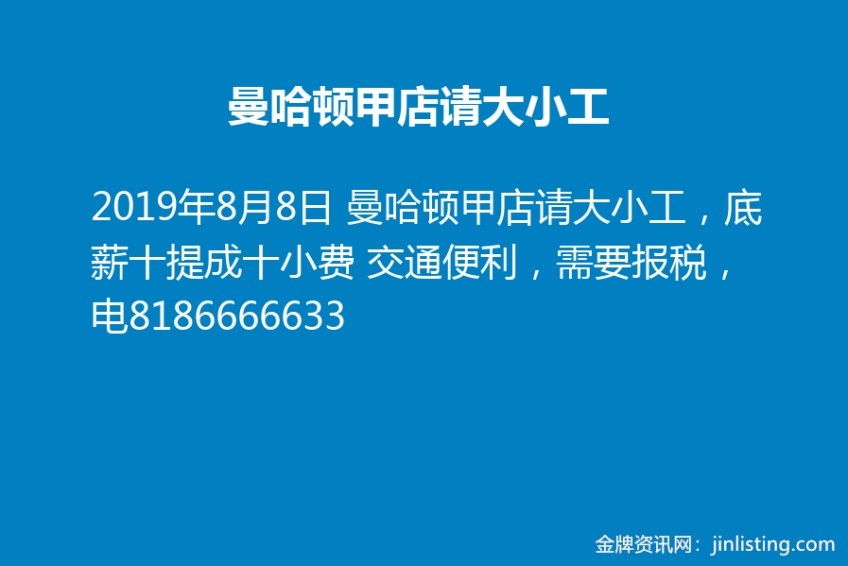 曼哈顿甲店请大小工 8186666633