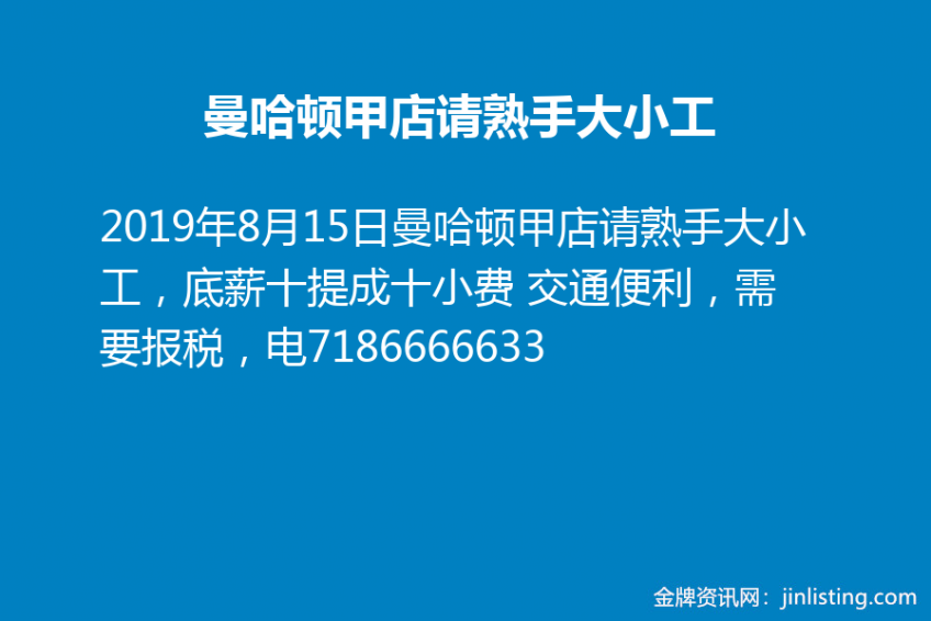 曼哈顿甲店请熟手大小工,底薪十提成十小费 交通便利,需要报税,电7186666633