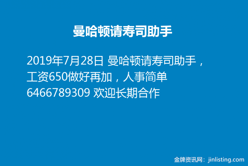 曼哈顿请寿司助手,工资650做好再加,人事简单6466789309 欢迎长期合作