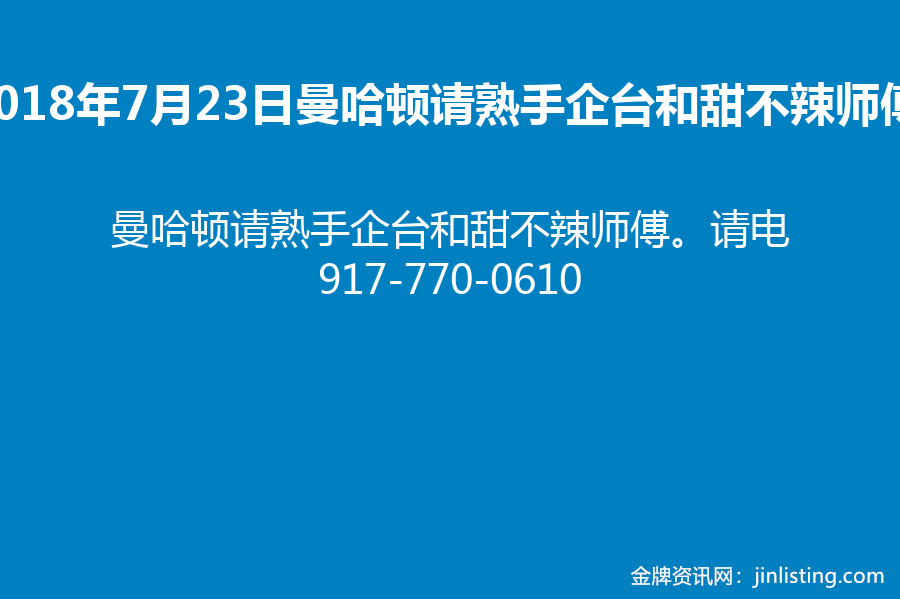 曼哈顿请熟手企台和甜不辣师傅。请电 917-770-0610
