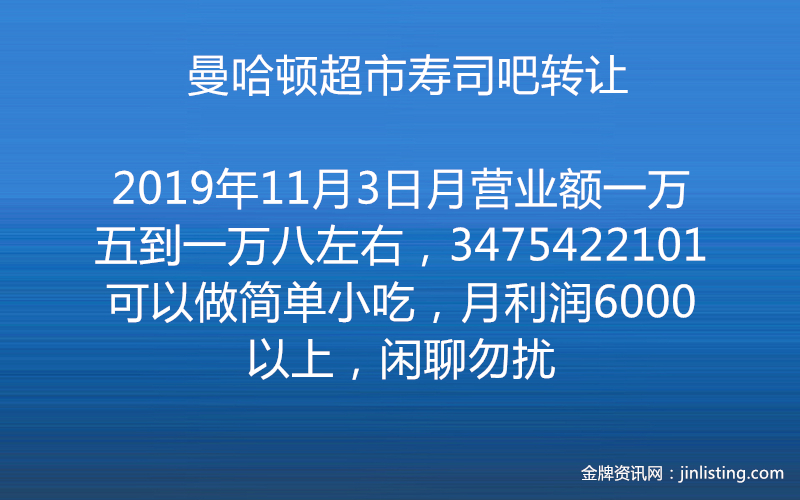 曼哈顿超市寿司吧转让,月营业额一万五到一万八左右,3475422101 可以做简单小吃,月利润6000以上,闲聊勿扰