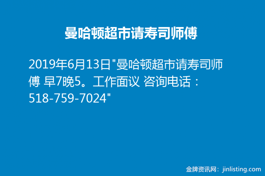“曼哈顿超市请寿司师傅 早7晚5。工作面议 咨询电话: 518-759-7024”