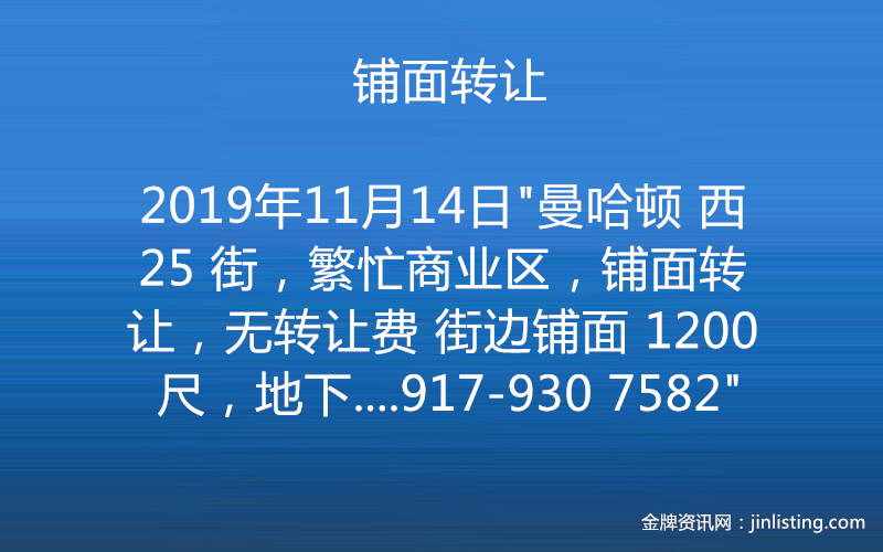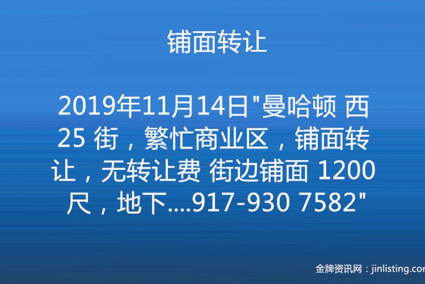“曼哈顿 西 25 街,繁忙商业区,铺面转让,无转让费 街边铺面 1200 尺,地下室 1000 尺。 房租+地税 总共仅:8700/月。适合各种行业 联系电话:917-930 7582”