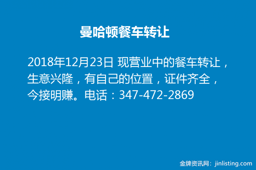 曼哈顿餐车转让 现营业中的餐车转让,生意兴隆,有自己的位置,证件齐全,今接明赚。电话:347-472-2869