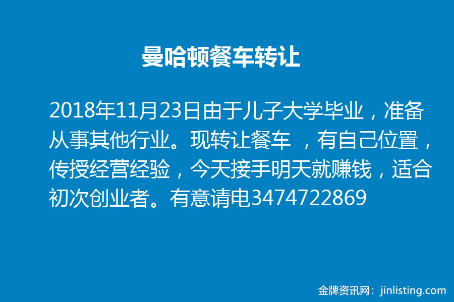 曼哈顿餐车转让 由于儿子大学毕业,准备从事其他行业。现转让餐车 ,有自己位置 ,传授经营经验,今天接手明天就赚钱,适合初次创业者。有意请电3474722869