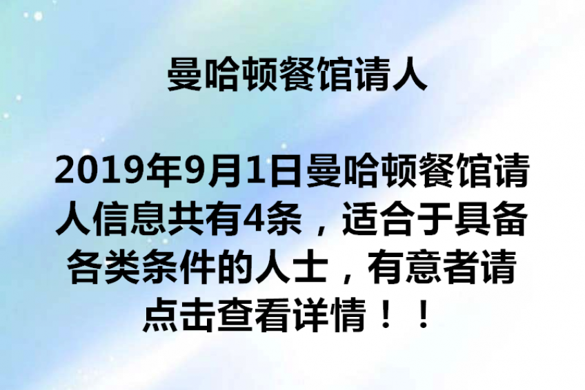曼哈顿餐馆请前台收银 $14/hr “要求: 1. 中英文流利 2. 有过奶茶店或餐馆相关经验 请电或短信:646-250-6688”