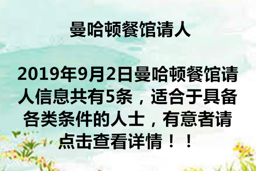 曼哈顿下城繁忙堂吃店诚请企台 busboy “要求会英文,能报税,积极上进有责任心,团队意识强 工作环境好,待遇优厚,有培养晋升空间 有意者请短信: 9293532110 Gin”