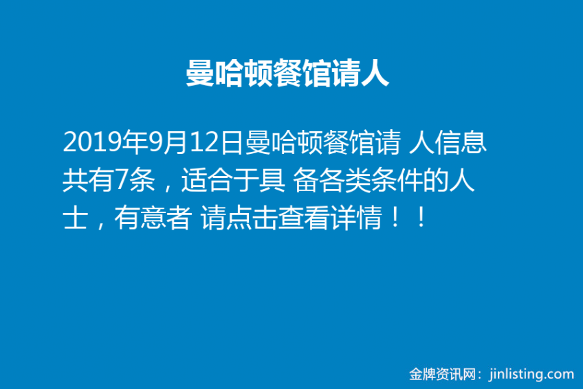 曼哈顿中餐请人 曼哈顿不忙中餐馆诚请抓码,洗碗师付各一名!有午休1小时厨房员工好相处。有意者请电646-592-5808详谈!非诚勿扰谢谢!
