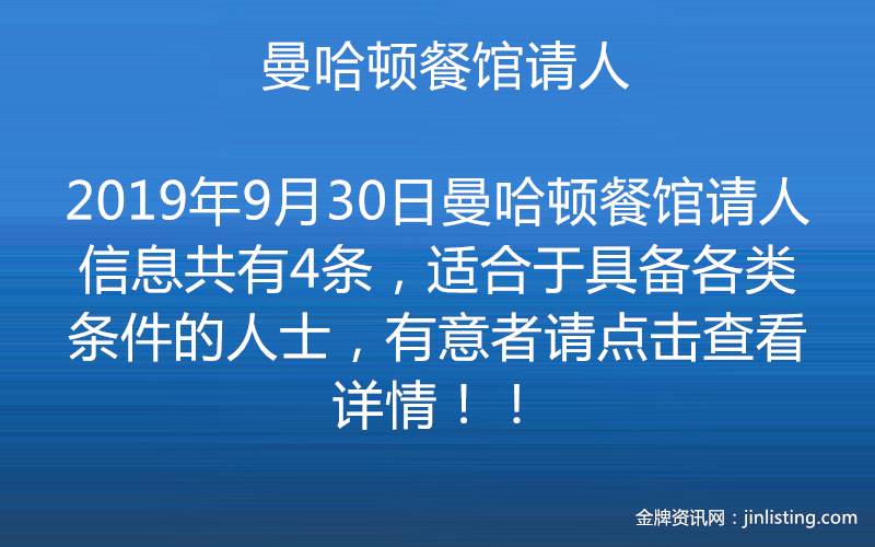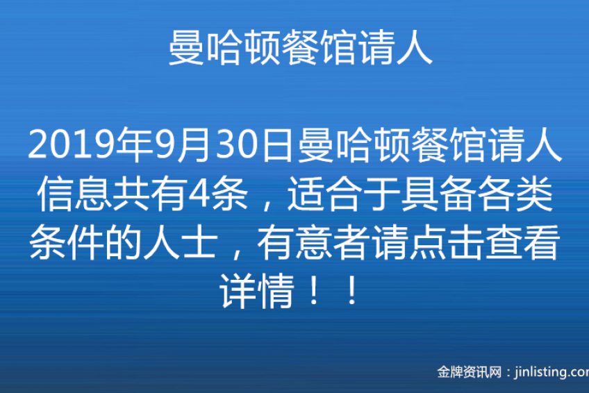 “曼哈顿吃堂招企台,需要半年以上经验。企台小费好,需要报税,兼职全职都可以。全职一周4-5天,兼职需要11点到3点; 曼哈顿吃堂招收银,需要半年以上经验。企台小费好,需要报税,兼职全职都可以。全职一周4-5天,兼职需要11点到3点。周六以及周日晚上。 曼哈顿吃堂招炒锅,川菜以及上海菜,需要有经验。 电话:9175725076”