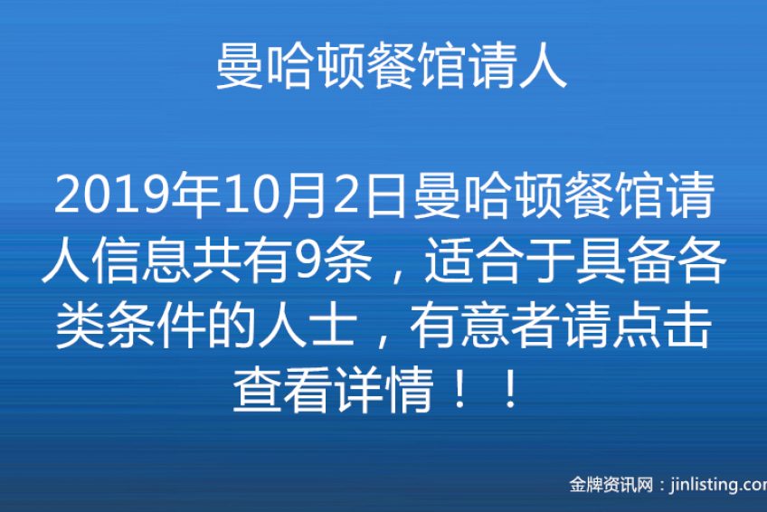 曼哈顿东村火锅店招聘全职女启台 “店长年轻好相处 工作环境好 要求:踏实努力 细心负责 中英文流利 可报全稅 工作时间7小时 有无工作经验均可 可培训 联系人电话:6464094080 孙先生(不回短信)”