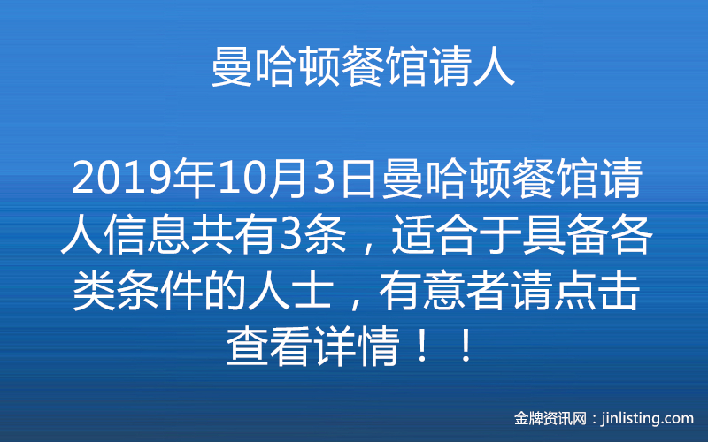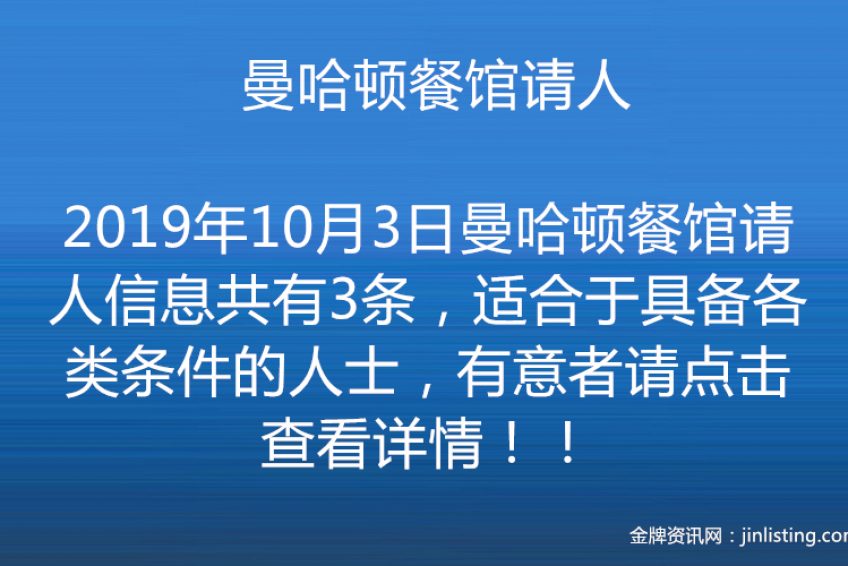 “曼哈顿吃堂招企台,需要半年以上经验。企台小费好,需要报税,兼职全职都可以。全职一周4-5天,兼职需要11点到3点; 曼哈顿吃堂招收银,需要半年以上经验。企台小费好,需要报税,兼职全职都可以。全职一周4-5天,兼职需要11点到3点。周六以及周日晚上。 曼哈顿吃堂招炒锅,川菜以及上海菜,需要有经验。 电话:9175725076”