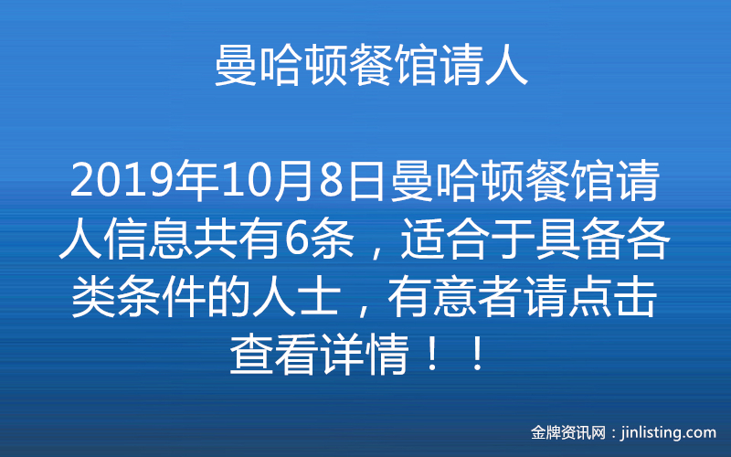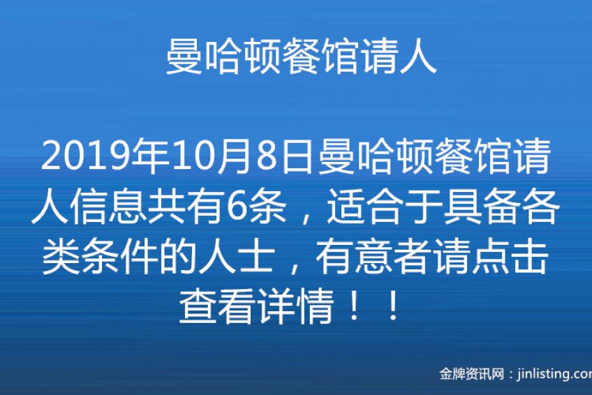 中餐急招企台、收银、炒锅 价格好! “曼哈顿吃堂招企台,需要半年以上经验。企台小费好,需要报税,兼职全职都可以。全职一周4-5天,兼职需要11点到3点; 曼哈顿吃堂招收银,需要半年以上经验。企台小费好,需要报税,兼职全职都可以。全职一周4-5天,兼职需要11点到3点。周六以及周日晚上。 曼哈顿吃堂招炒锅,川菜以及上海菜,需要有经验。 以上一个月均4000+可商量 电话:9175725076”