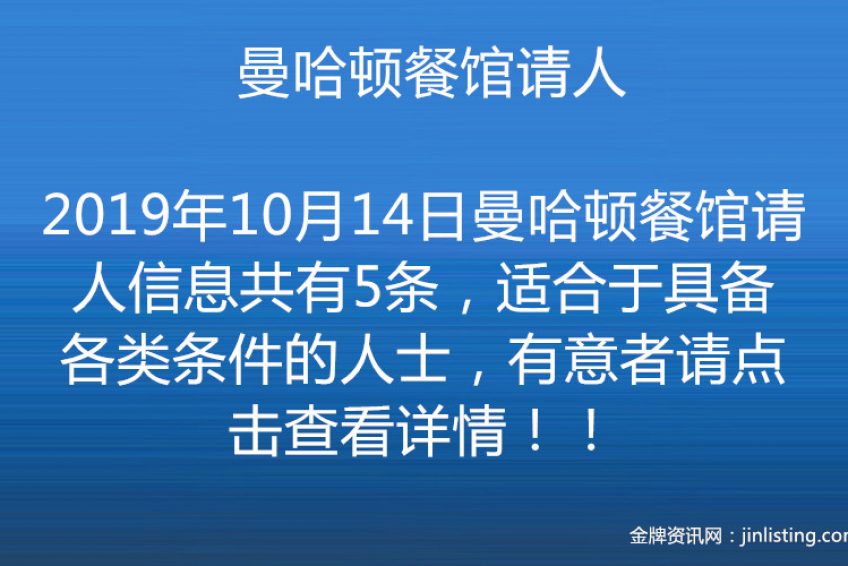 曼哈顿火锅店招人啦! “有没有想找工作的蓝孩纸呀 曼哈顿火锅店招人啦! 店长年轻好相处 待遇好环境优 有底薪+小费 只要你是一个踏实 努力的人 中英文流利 可以报全稅 有餐饮行业/火锅店工作经验 最好有食品卫生许可证 我们都欢迎你加入我们的团队! 详情请电话或短信咨询 6464094080 哦~”