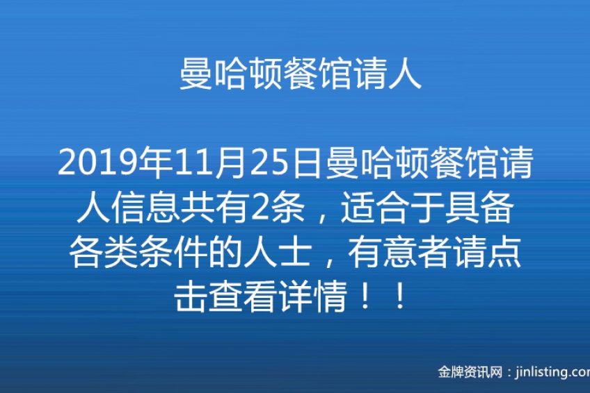 1. “曼哈顿餐厅请前厅经理,需有身份,可保税,流利中英文,5年以上工作经验,工作认真负责。 电话:jason:3473792716(10:00am-6:00pm)”
