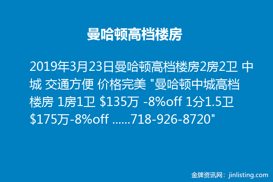 曼哈顿高档楼房2房2卫 中城 交通方便 价格完美 “曼哈顿中城高档楼房 1房1卫 $135万 -8%off 1分1.5卫 $175万-8%off 2房2卫 $192万-8%0ff 2房2卫 $225万-8%0f f 还有很多物件 随时咨询 电话:718-926-8720”