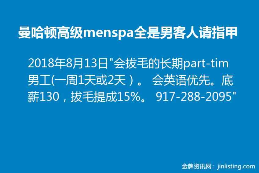 “曼哈顿高级menspa(全是男客人)请指甲、会拔毛的长期part-tim男工(一周1天或2天)。 会英语优先。底薪130,拔毛提成15%。 917-288-2095”