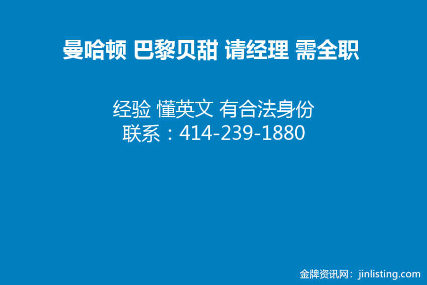 曼哈顿 巴黎贝甜 请经理 需全职 有经验 懂英文 有合法身份