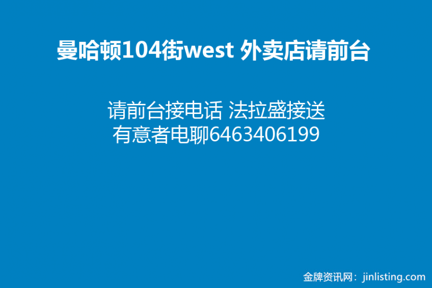 曼哈顿104街west 外卖店请前台接电话 法拉盛接送 有意者电聊6463406199