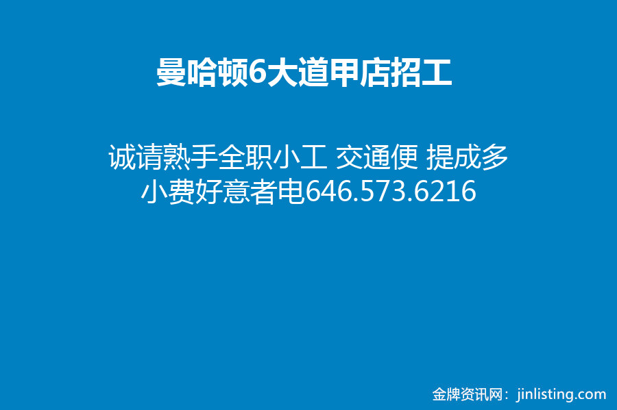曼哈顿6大道甲店招工 “诚请熟手全职小工 交通便 提成多 小费好