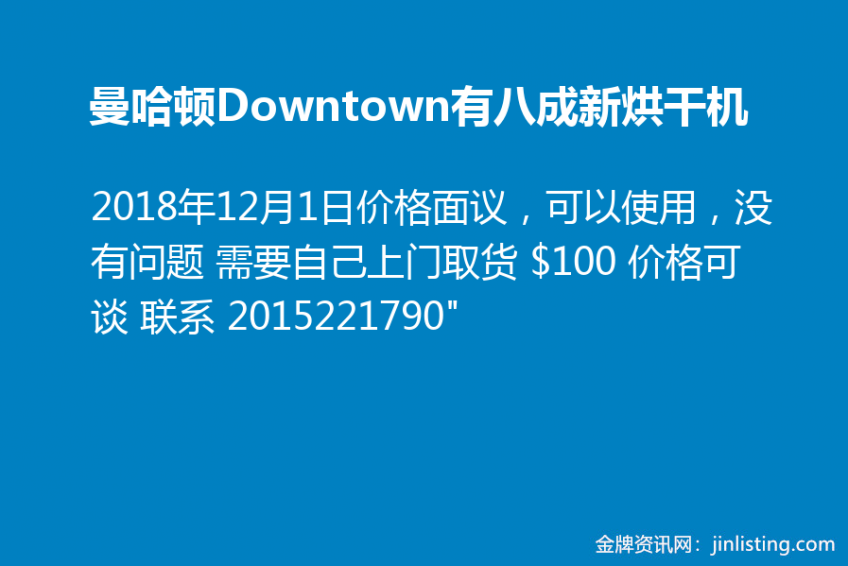 “曼哈顿Downtown有八成新烘干机,价格面议,可以使用,没有问题 需要自己上门取货 $100 价格可谈 联系 2015221790”