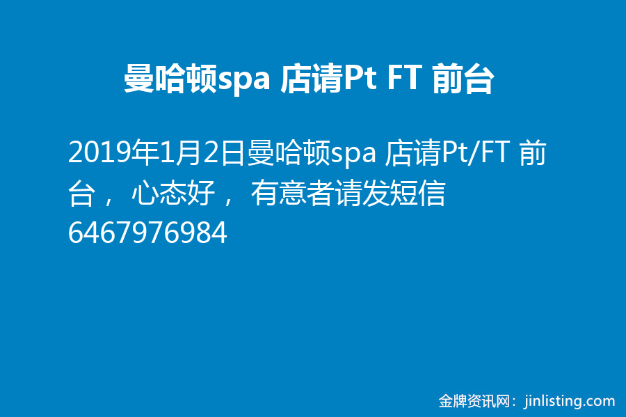 曼哈顿spa 店请Pt/FT 前台 6467976984