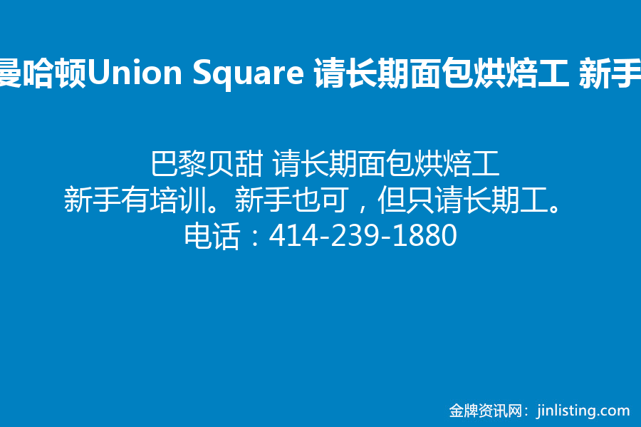 曼哈顿Union Square 附近巴黎贝甜 请长期面包烘焙工 新手也召 414-239-1880″