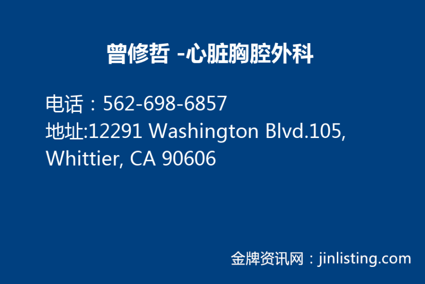 曾修哲(开心)医学博士,毕业于布鲁伦下州附属医学院一般外科及俄州西储凯斯医学院心脏胸腔外科,是南加州首位华人心脏胸腔血管外科专家,拥有美国外科专家文凭及美国胸腔(心脏血管)外科专家文凭,曾在耶鲁大学附属医院医院实习,现主治心脏胸腔血管外科于惠提尔医院、惠提尔长老会医院、但尼区域性医学中心及安那罕医学中心。曾医师在心脏外科方面专精成人心肌梗塞、衰竭、各式搭桥绕道手术、心瓣膜更换、整型手术;在胸腔外科方面,专精肺癌肿瘤、肺气肿、胸腺瘤、重症肌无力、手汗症(内视镜交感神经切除术)及食道手术;在血管外科方面,专精大小动脉阻塞、肿瘤、静脉曲张。曾医师有20余年专科手术经验,待病患如家人,亲切和蔼,深获病患的一致推崇与赞扬。