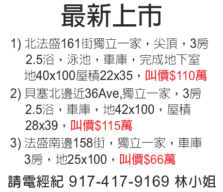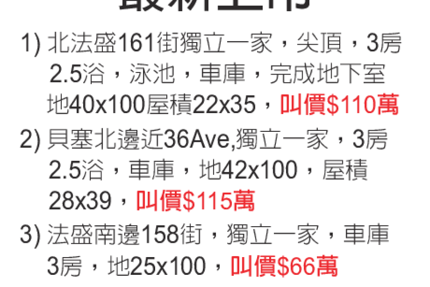 1)北法盛161街 独立一家,尖顶,3房2.5浴,泳池,车库,完成地下室.地40×100.屋积22×35,叫价 110万