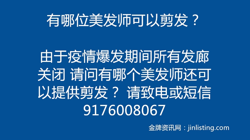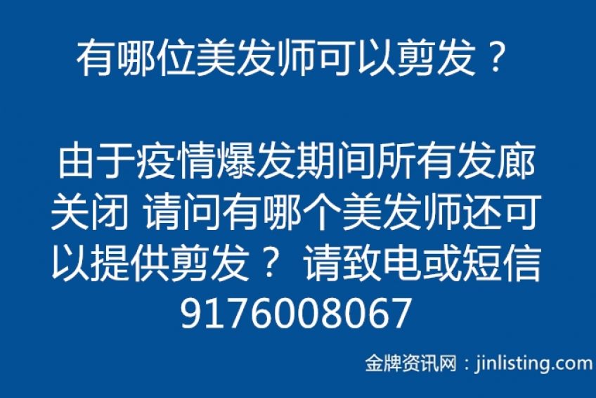 有哪位美发师可以剪发? 由于疫情爆发期间所有发廊关闭 请问有哪个美发师还可以提供剪发? 请致电或短信9176008067