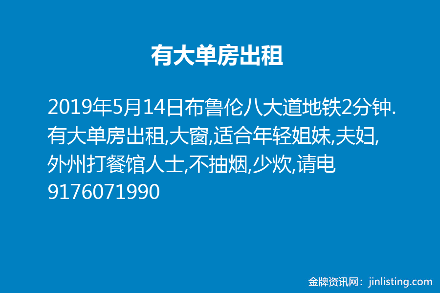 布鲁伦八大道地铁2分钟.有大单房出租,大窗,适合年轻姐妹,夫妇,外州打餐馆人士,不抽烟,少炊,请电9176071990